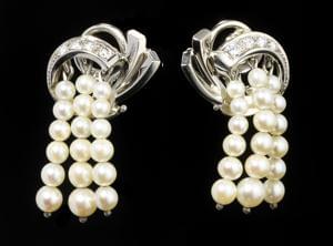 3304. Clips d'oreilles retenant trois lignes de perles en pampille reh...