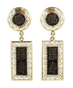 3309. Pendants d'oreilles ajourés et émaillés, ornés d'écritures chino...