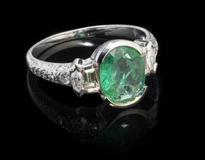 3316. *Bague sertie d'une émeraude taille ovale (env. 1 ct) épaulée de...