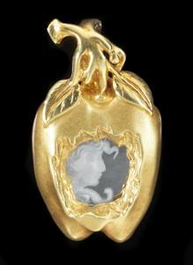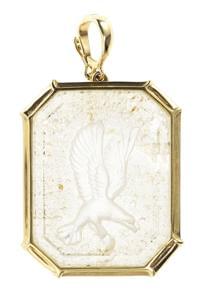 3323. Pendentif serti d'une plaque de cristal de roche sculpté à motif...