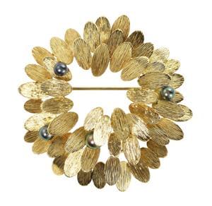 3325. Broche circulaire stylisée en or brossé sertie de petites perles...