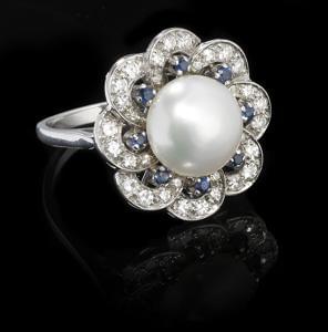 Entourée de perles probablement fines et rehaussée de diamants,...