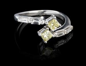 3313. Bague centrée de quatre saphirs jaunes entourés et épaulés de di...