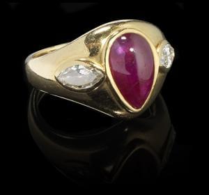 3362. Bague centrée d'un rubis taille cabochon poire (env. 10,5x6,4 mm...