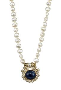 3381. Collier de perles retenant un pendentif serti d'un saphir taille...