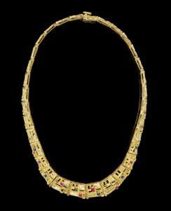 3416. Collier ajouré stylisé ponctué de rubis et de saphirs taille car...