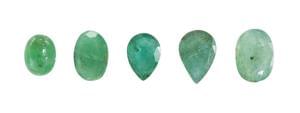 3432. *Lot de cinq émeraudes taille ovale et taille poire sur papier