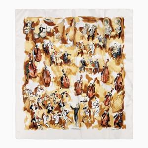 A décor de musiciens sur fond ivoire et camel, signé Clerc, soie...
