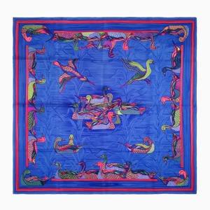 A décor de canards multicolores sur fond bleu et rouge, soie, en...