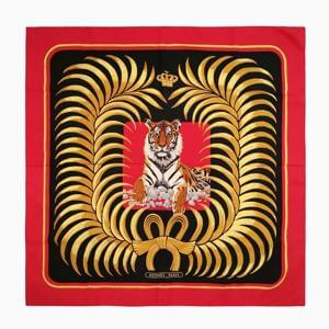 A décor d'un tigre, d'une couronne sur fond rouge et noir, soie,...
