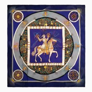 A décor d'un cavalier sur fond bleu et gris, soie, 88x88 cm. Dan...