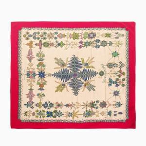 A décor de fougères et ornements sur fond beige et bordure rouge...