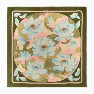 A décor de fleurs de lotus sur fond beige et rose, bordure kaki,...