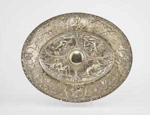 3781. Plat ovale à riche décor repoussé des allégories des quatre sais...