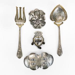 3794. Deux boucles, une broche cœur couronnée et couverts de service à...