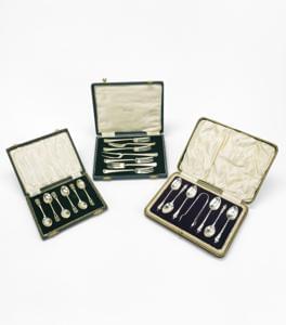 3807. Trois écrins: 6 cuillères à thé apôtre, 6 ajourées à motif de fl...