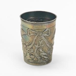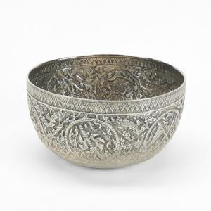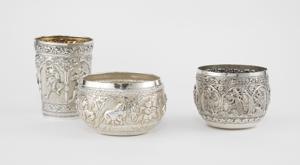 3837. Timbale et deux bols à décor repoussé de personnages et animaux