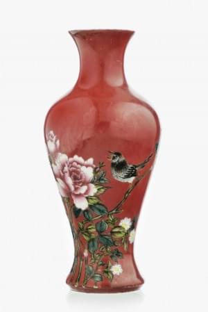 Porcelaine émaillée à décor de pies et pivoines sur fond rouge,...
