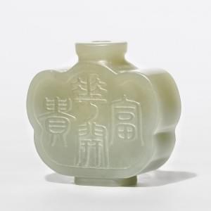 Jade céladon à décor de fleurs et caractères archaïques, H 5 cm