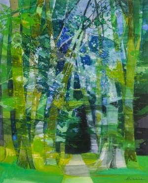 Verre multicouche dégagé à l'acide à décor d'un paysage lacustre...
