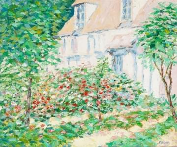 Rivière et jardin, deux huiles sur toile, signées, 49x59 cm