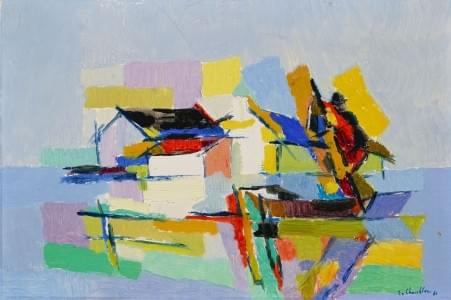 Port de pêche en Espagne, 1960, huile sur toile, signée et datée...