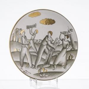 Grand plat à décor d'une scène de moisson, faïence émaillée gris...