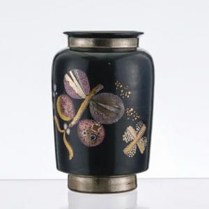 Vase à décor de papillons, céramique émaillée noir, rose et or,...