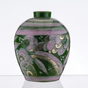 Vase ovoïde à décor végétal, céramique émaillée vert, rose et ar...