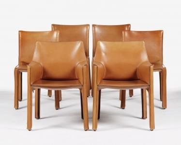Paire de fauteuils et quatre chaises Cab, numéro 412, cuir fauve