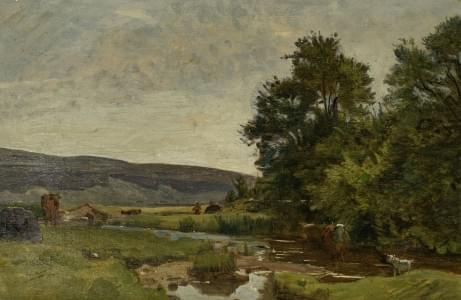 Vache s'abreuvant dans un paysage de montagne, huile sur panneau...