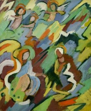 Sainte famille et anges, huile sur carton marouflé sur toile, si...