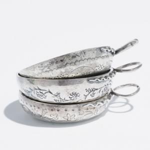 487. Ecuelle et taste-vin d'époque Charles II à décor repoussé de fle...