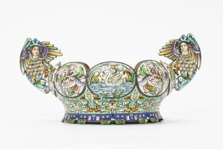 596. Coupe ronde à anses Sirine et bordure d'oves décorée en émaux cl...