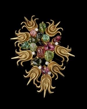 725. Broche pendentif stylisée sertie de tourmalines polies de divers...