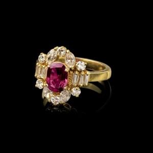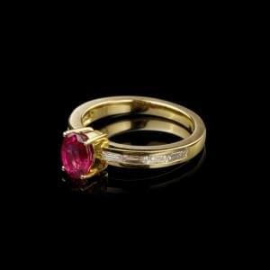 749. Bague sertie d'un rubis rond (env. 1 ct) épaulé de diamants tail...