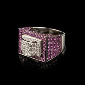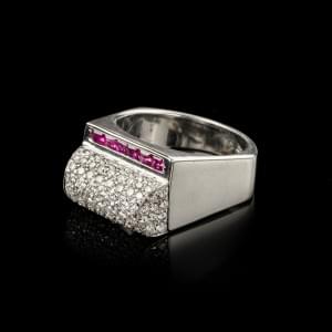 766. Bague triangle pavée de diamants (env. 0,65 ct) et de saphirs ro...