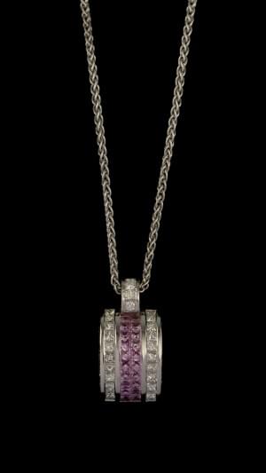 768. Collier retenant un pendentif serti de saphirs roses taille prin...