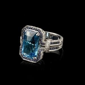 770. Bague sertie d'une topaze bleue rectangulaire (env. 8 ct) entour...