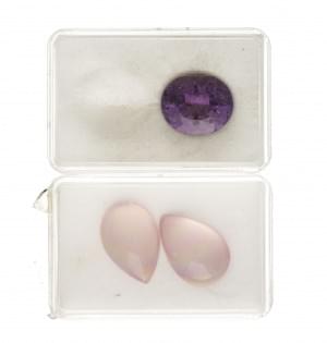 3163. Lot de trois pierres sur papier, deux quartz roses taille caboch...
