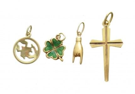 3181. Lot de quatre pendentifs à motifs de croix, main, trèfle et sign...