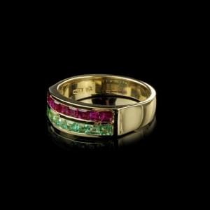 3296. Bague sertie de deux rangs de rubis et d'émeraude taille princes...