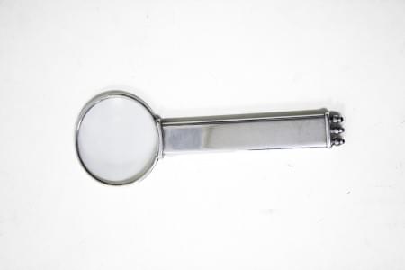3409. Loupe à manche droit finissant par trois cabochons de verre roug...