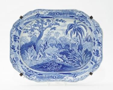 3420. Grand plat à décor blanc bleu de chasse au léopard