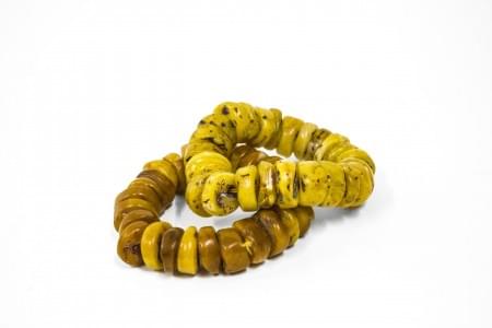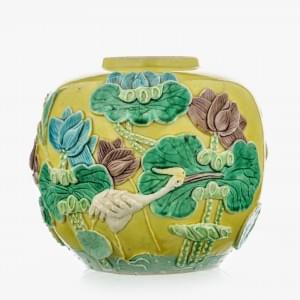 A décor de grues et lotus en relief sur fond jaune, H 11 cm
