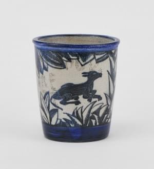 Vase seau, céramique émaillée bleu sur fond ivoire à motif d'ani...