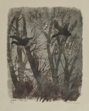 Couple de chouettes, Bernex, 8 févr. 1962, gravure sur bois, mon...
