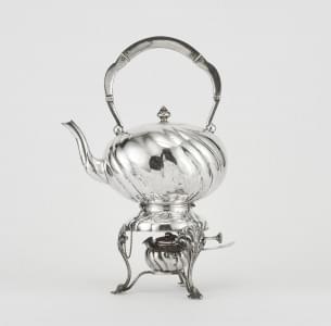 462. Théière boule sur réchaud à motifs de festons torses et pieds d'...