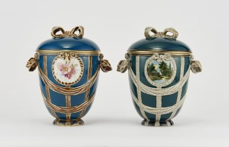 465. Deux vases couverts à motif de rubans noués et drapés sur fond b...