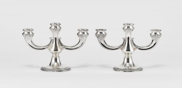 459. Paire de candélabres à 6 feux de style Rocaille, armoriés Herwar...